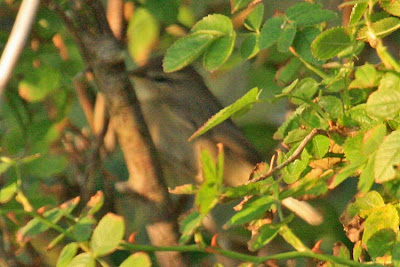 As it had disappeared yesterday before I got a look I made my way up to the area everyone was watching. After a few tantalising glimpses I did manage of few seconds when it appeared on the ground it a gap in the vegetation. After that it promptly flew off to the edge of a garden nearby. Fortunately it carried on regularly giving its quiet "Tak" call, not unlike a Lesser Whitethroats call, but less sharp and emphatic. It was this call and Brendans sharp ears that had led to it being found this morning. We could see it moving about, but on the few occasions it came in the open, it moved on before I could get my camera on it.